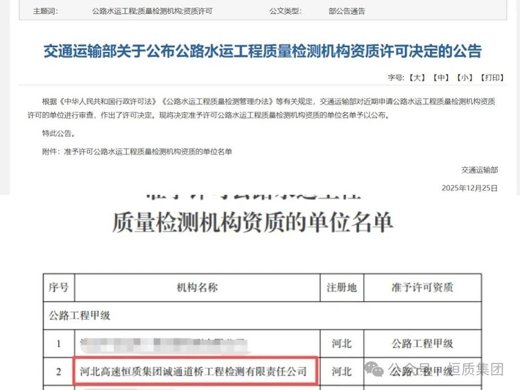12月30日,河北高速恒質(zhì)集團(tuán)誠(chéng)通檢測(cè)公司獲得公路工程試驗(yàn)檢測(cè)甲級(jí)資質(zhì),標(biāo)志著恒質(zhì)集團(tuán)在交通基礎(chǔ)設(shè)施質(zhì)量檢測(cè)領(lǐng)域?qū)崿F(xiàn)重要突破,是集團(tuán)服務(wù)交通強(qiáng)國(guó)戰(zhàn)略、提升核心專